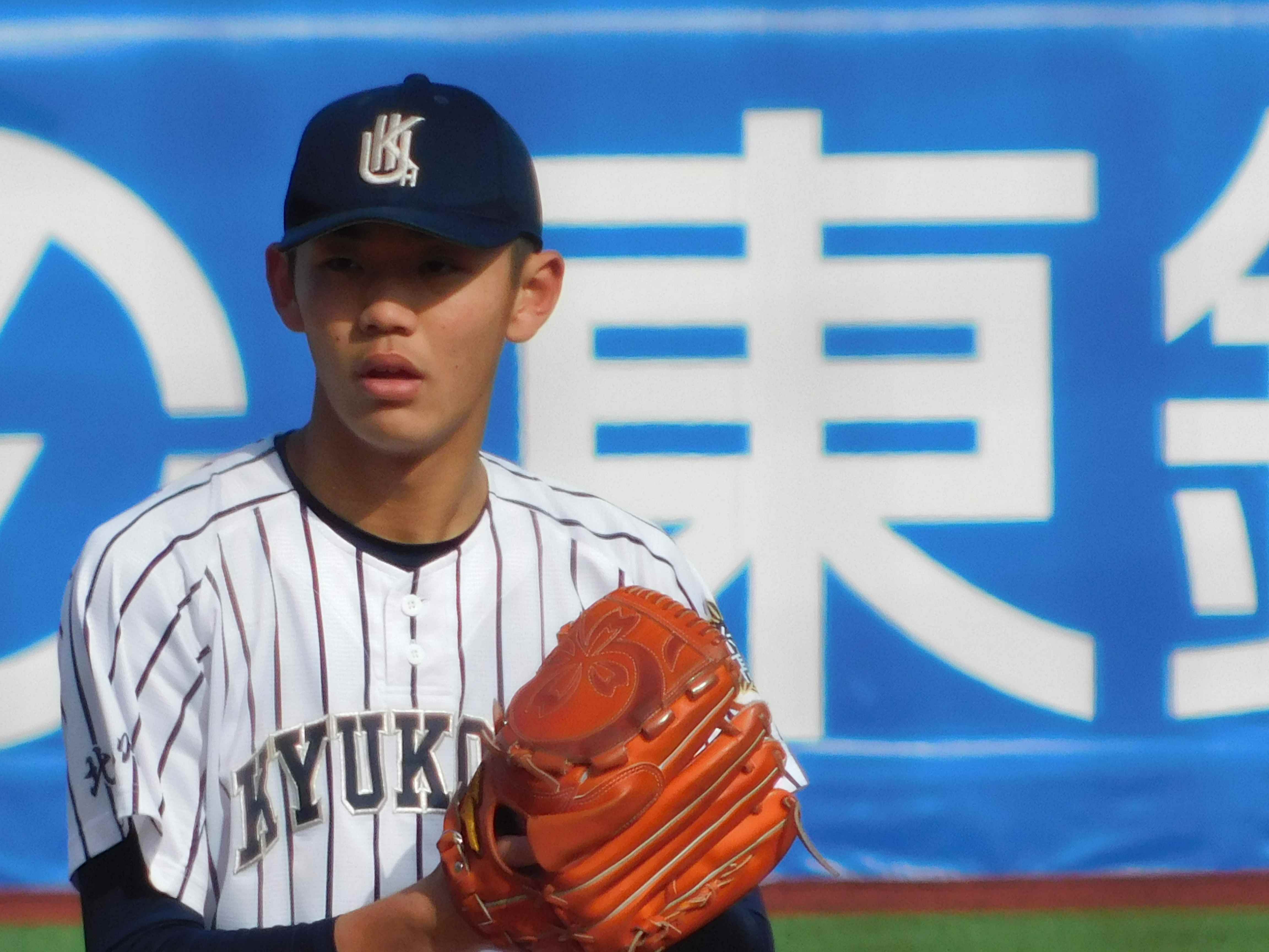 今大会で特に紹介したい選手としては、九州国際大付属から二人の選手をあげたいと思います。一人目は岩見投手です。今年はまだ1年生、エースの渡邊投手に対して控えの投手という位置づけです。今大会ではライトの他に一塁の守備にもつきました。山梨学院戦で先発し8回途中まで投げ4失点で奪三振が8。そして、先述のように決勝でも先発し無失点で奪三振が10と大事な試合で好投しています。