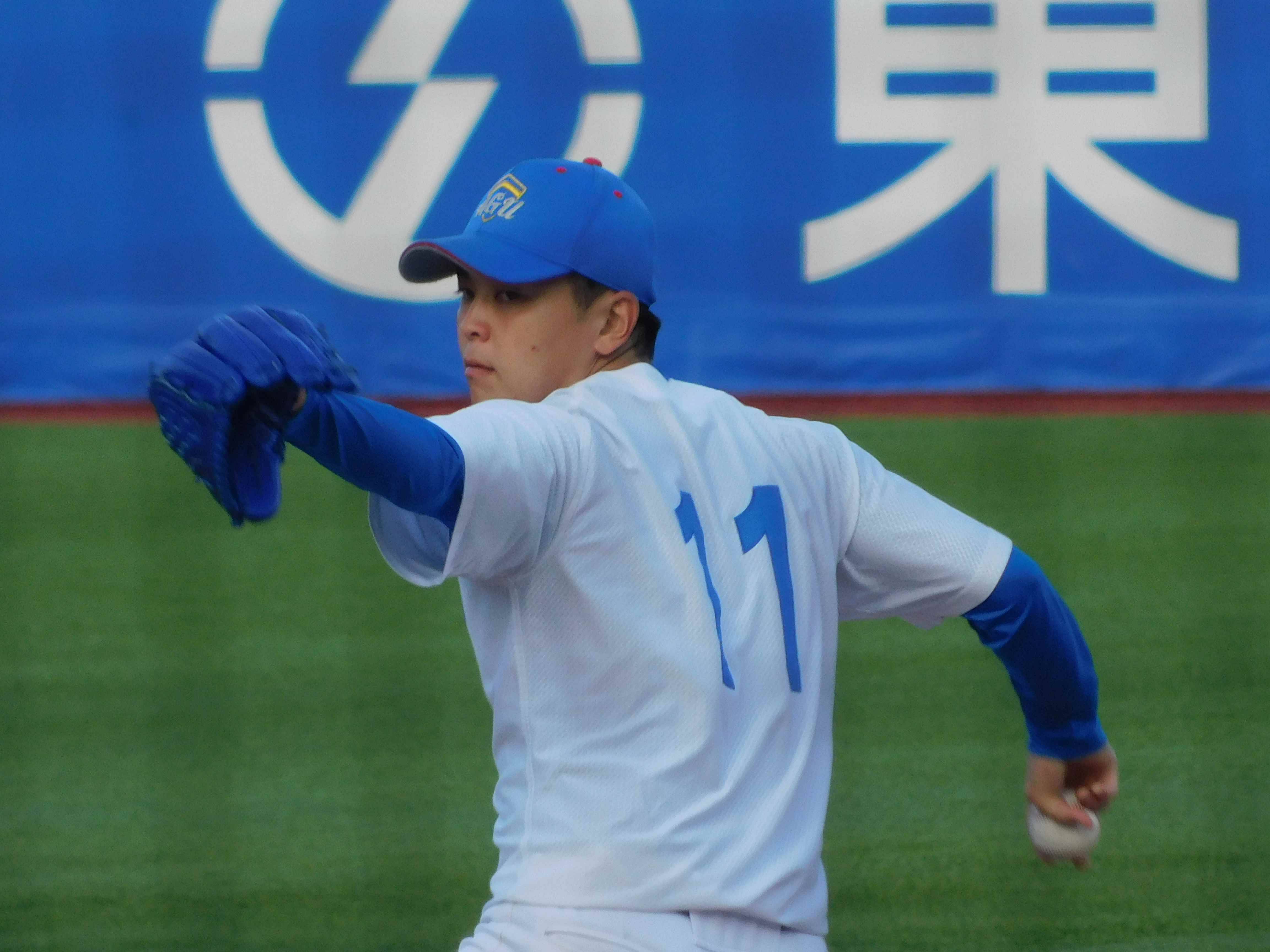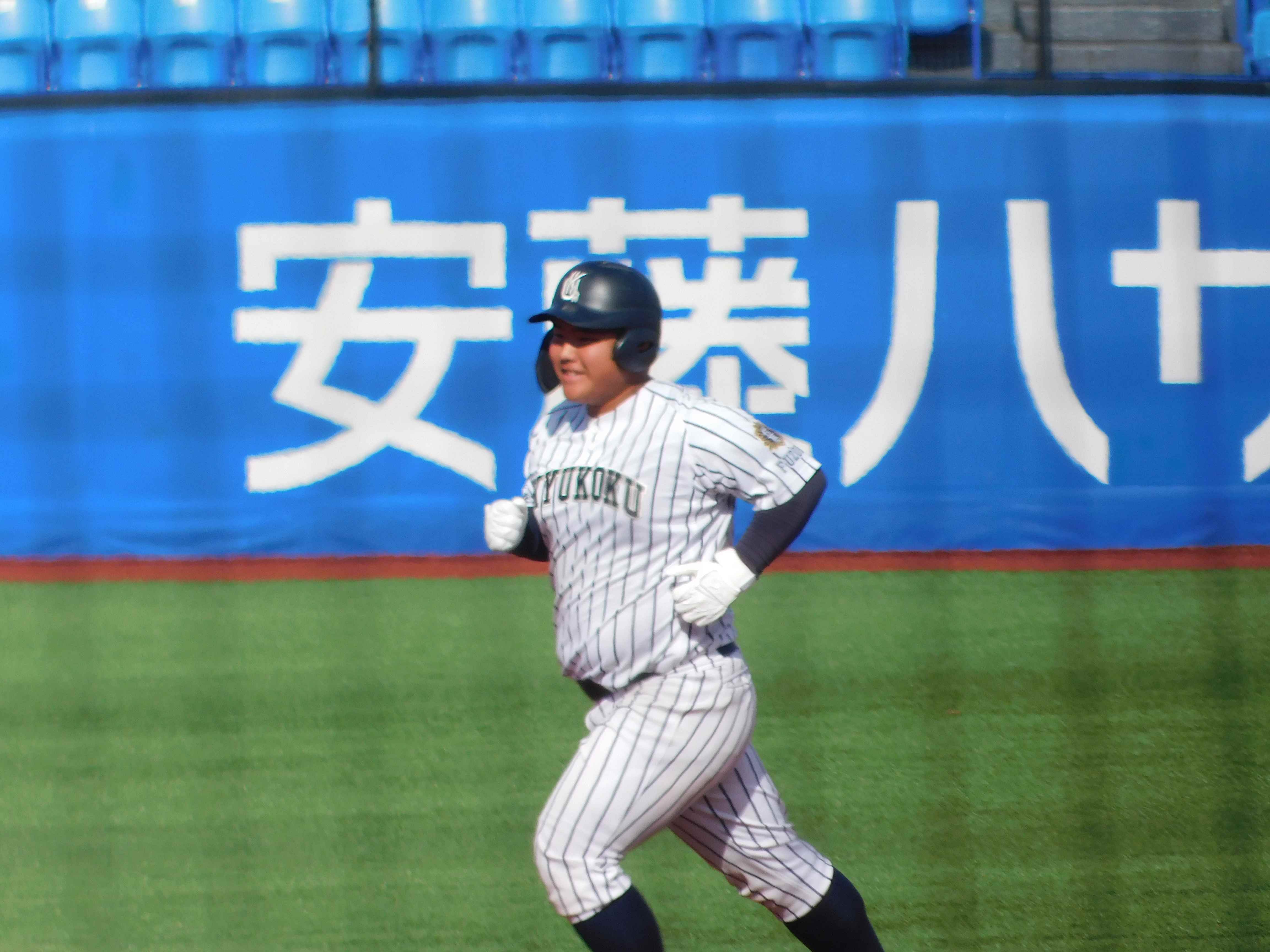 関西五連盟第一代表の佛教大は初戦の日本文理大にコールドで快勝したのち、2回戦で青山学院大と対戦しました。佛教大は野村亮輔投手(3年 綾羽)、青山学院大が中中西投手の先発で試合開始。佛教大は野村投手の制球が安定せず、三上明斗投手(3年 洛東)、合木凛太郎投手(4年 高田商)、赤木晴哉投手(4年 天理)で繋ぎますが、青山学院大は4回と5回に1点ずつ奪い、一方佛教大は9回に1点を返したものの、2対1で青山学院大が佛教大を下しました。中西投手は被安打3、奪三振11、与えた四死球は2つだけと見事なピッチングで9回を投げ切っています。中西投手が登板したのはこの佛教大戦と決勝の立命館大戦の2試合のみですが、2試合とも打者を寄せ付けないピッチングで完投。かなり実力のある投手だと実感させられた試合でした。